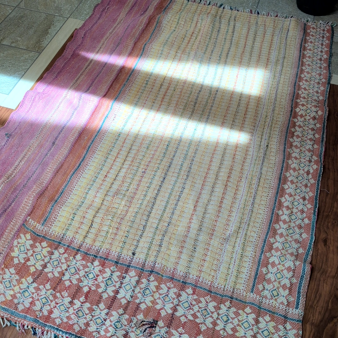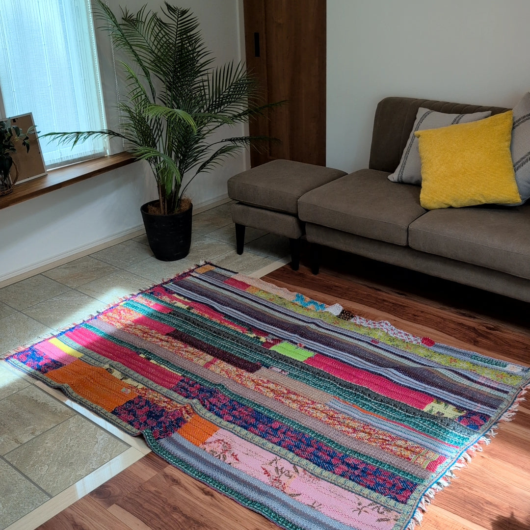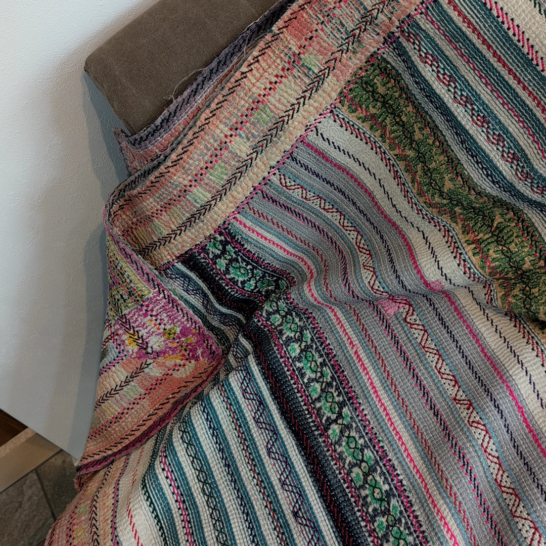 古い布を何層も重ね、時間をかけて全体に施される細かなステッチ。この手縫いの連なりは、単なる補強ではありません。過去の布の歴史を丁寧に受け継ぎ、新たな命を吹き込む、文化的な継承の技です。